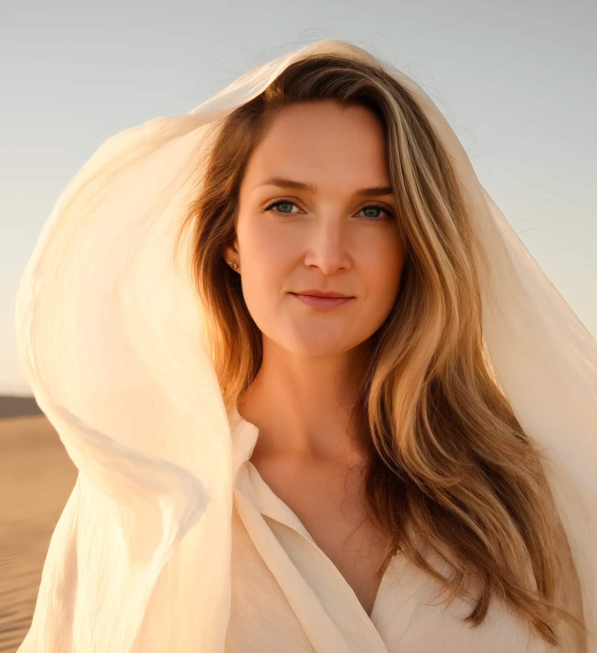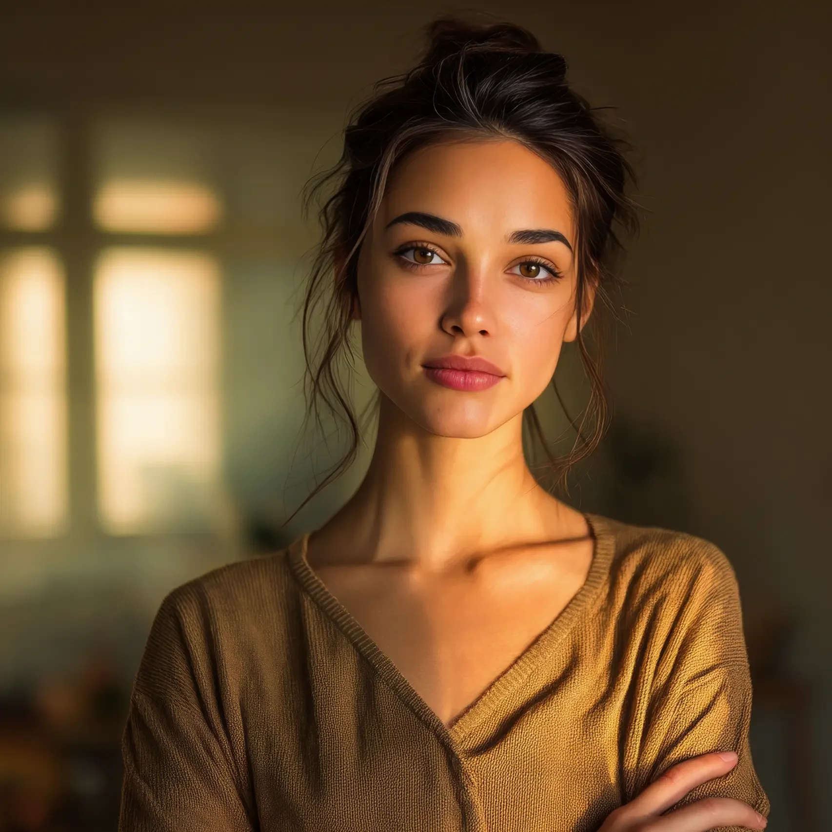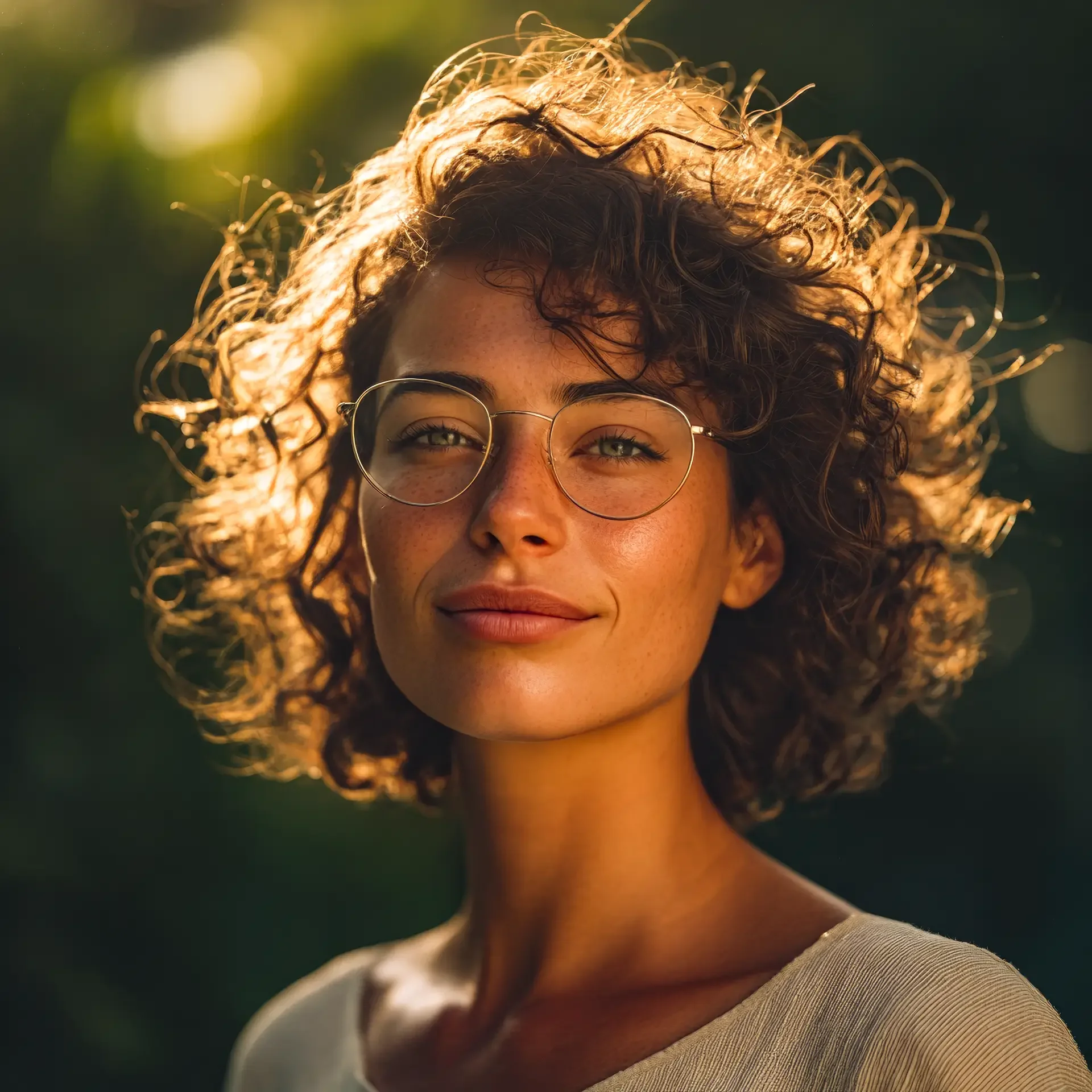 A close-up portrait of a woman with a radiant, joyful smile, representing the outcome of the QuantumBFF process. The warm, golden light and her authentic expression symbolize the pure joy and freedom of creating a life you are wildly obsessed with.